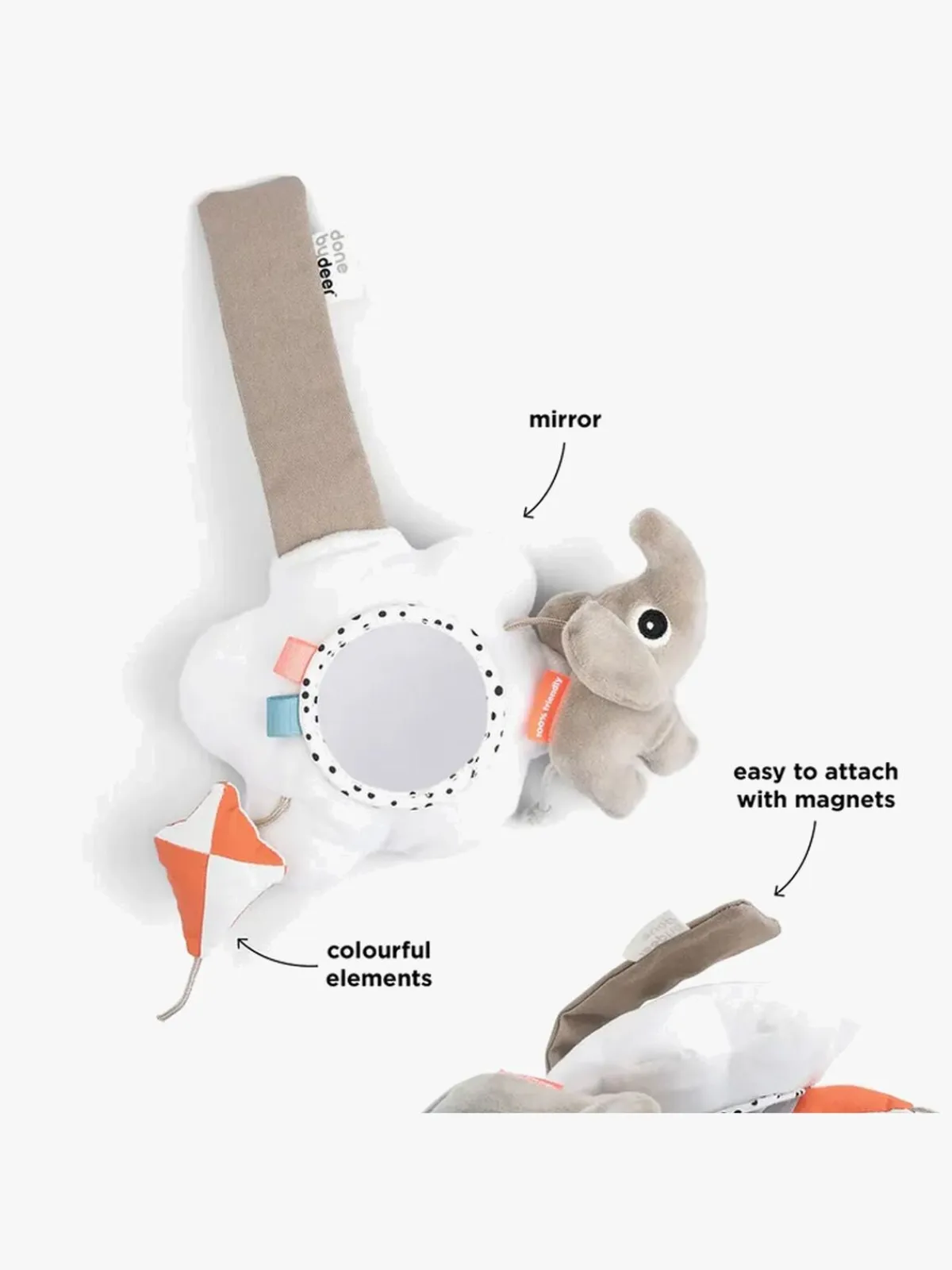 – Sjove farver og et spejl til visuel stimulering.
