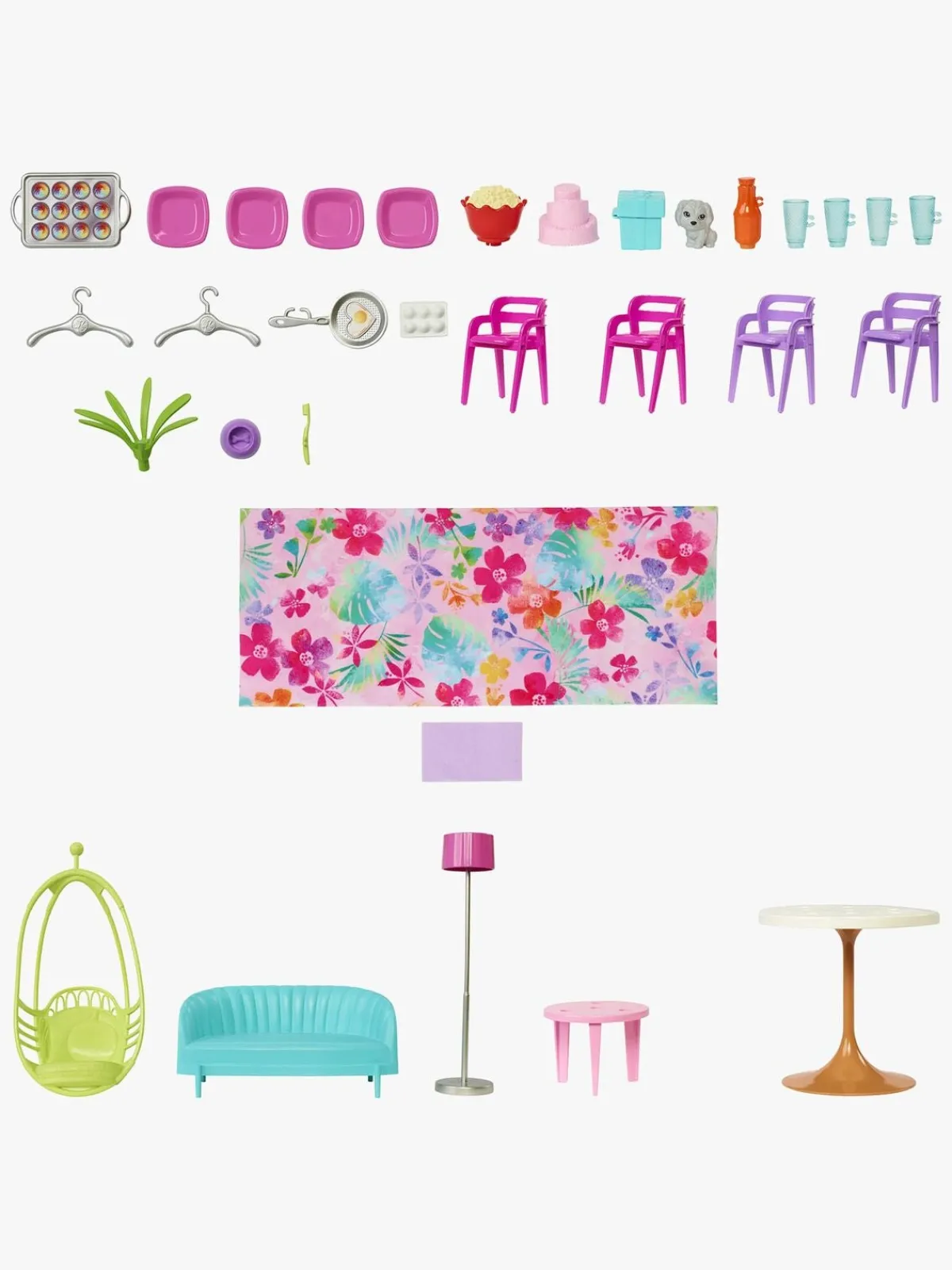 – Indeholder: 1 Barbie-feriehus, 1 gyngestol, 1 sofa, 4 stole, 1 spisebord, 1 lampe og andet tilbehør til fantasifuld leg.