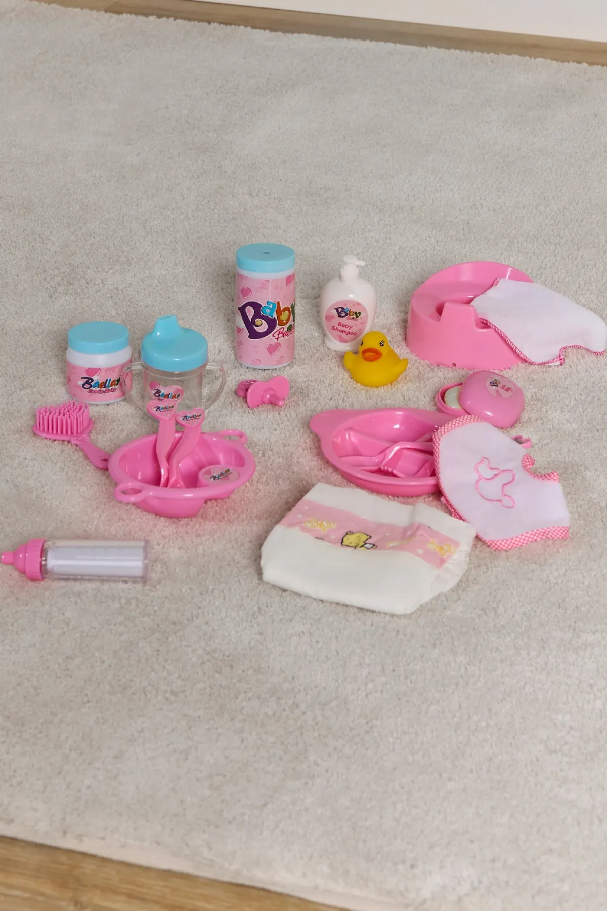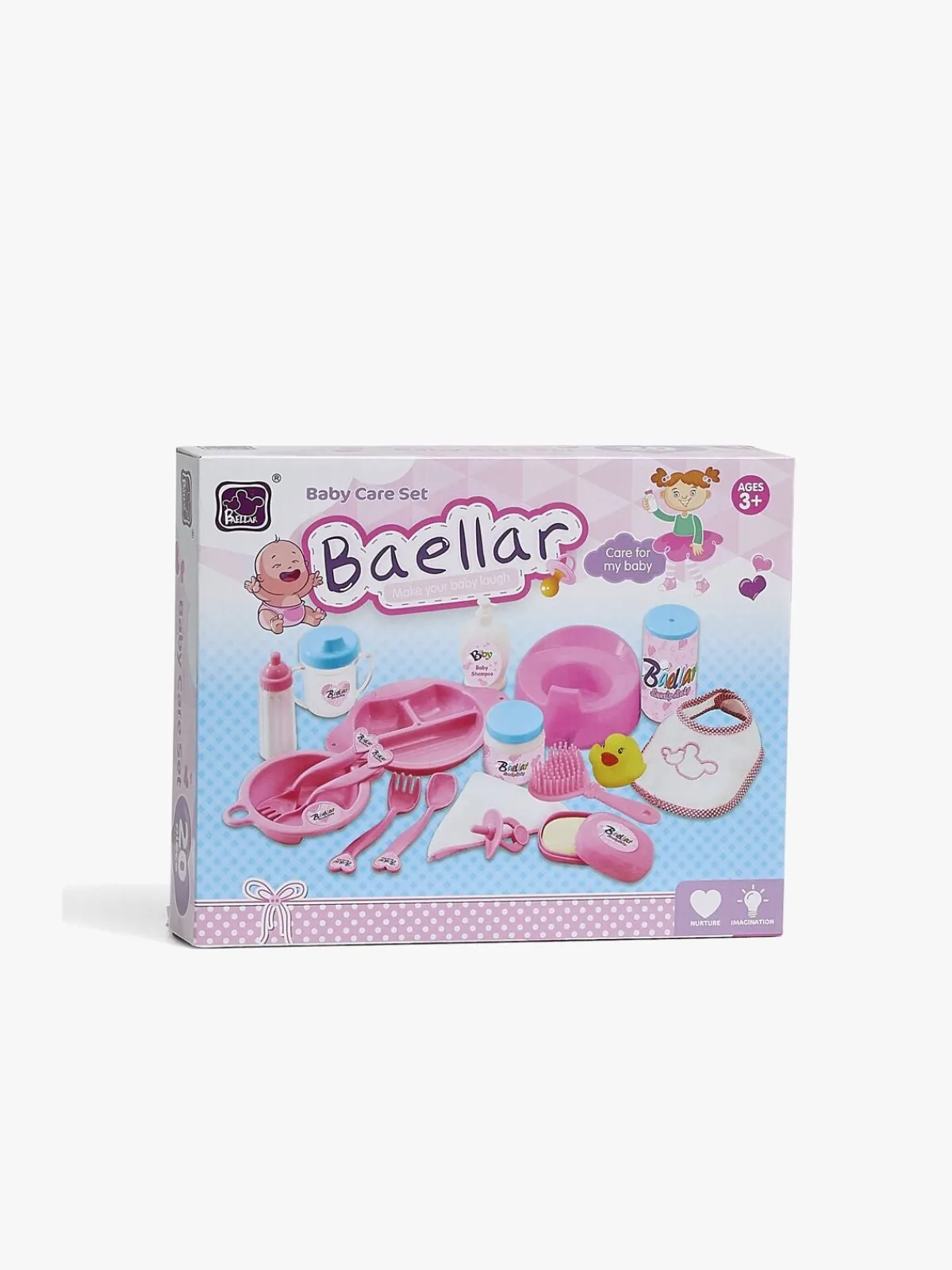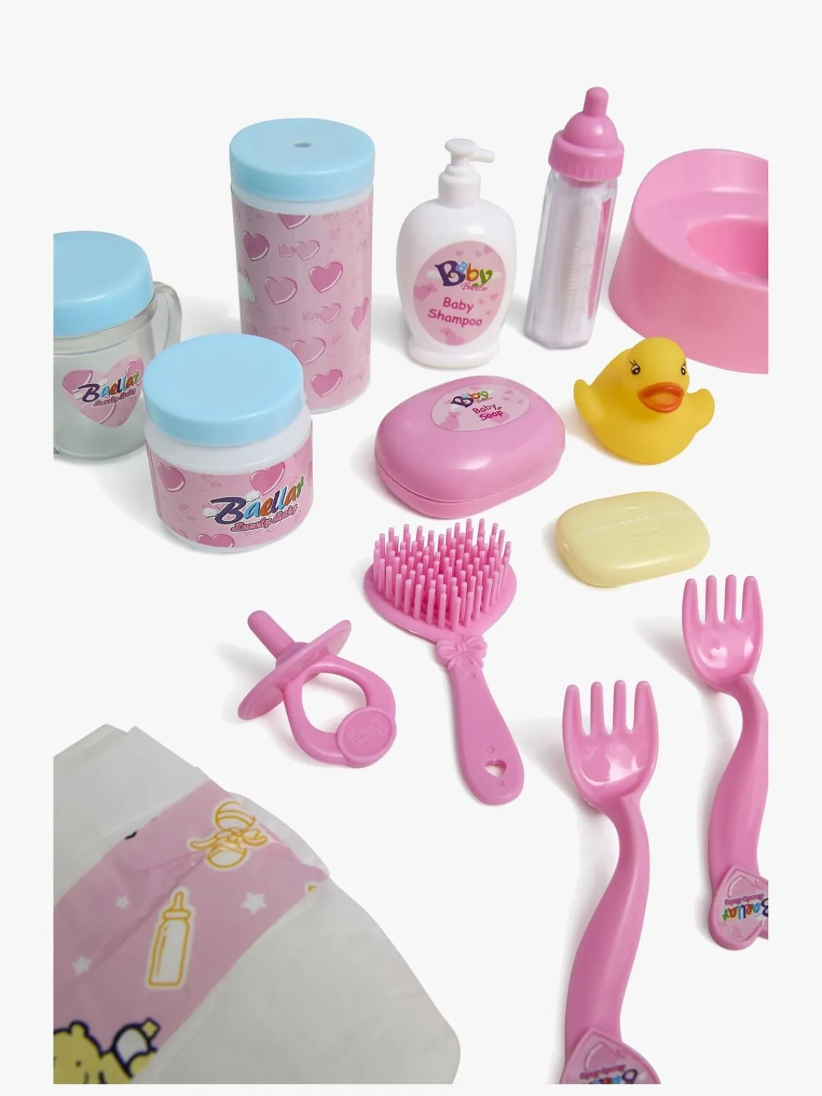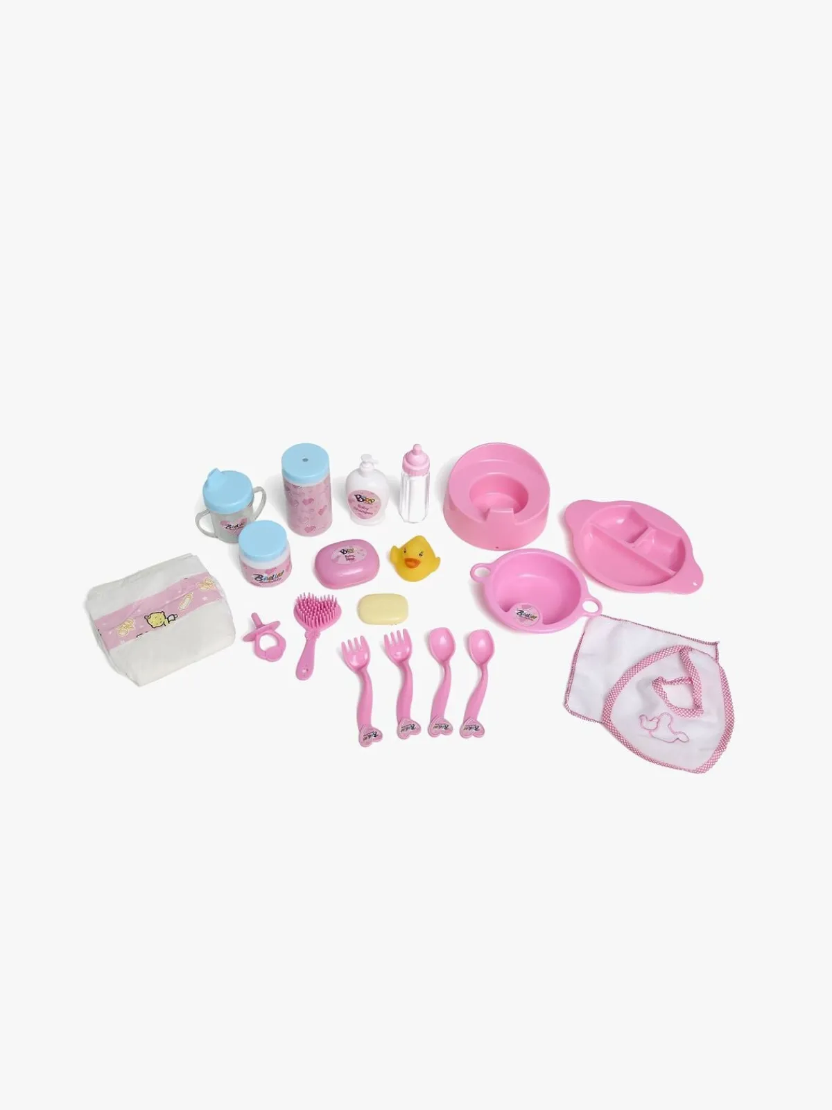 – Indeholder: 1 potte, 1 flaske, 1 tudekop, 2 gafler, 2 skeer, 2 tallerkener, 1 hagesmæk, 1 sut, 1 badeand, 1 ble, 1 børste, 1 sæbe, 1 bodycreme, 3 brusebadstilbehør, 1 vaskeklud.