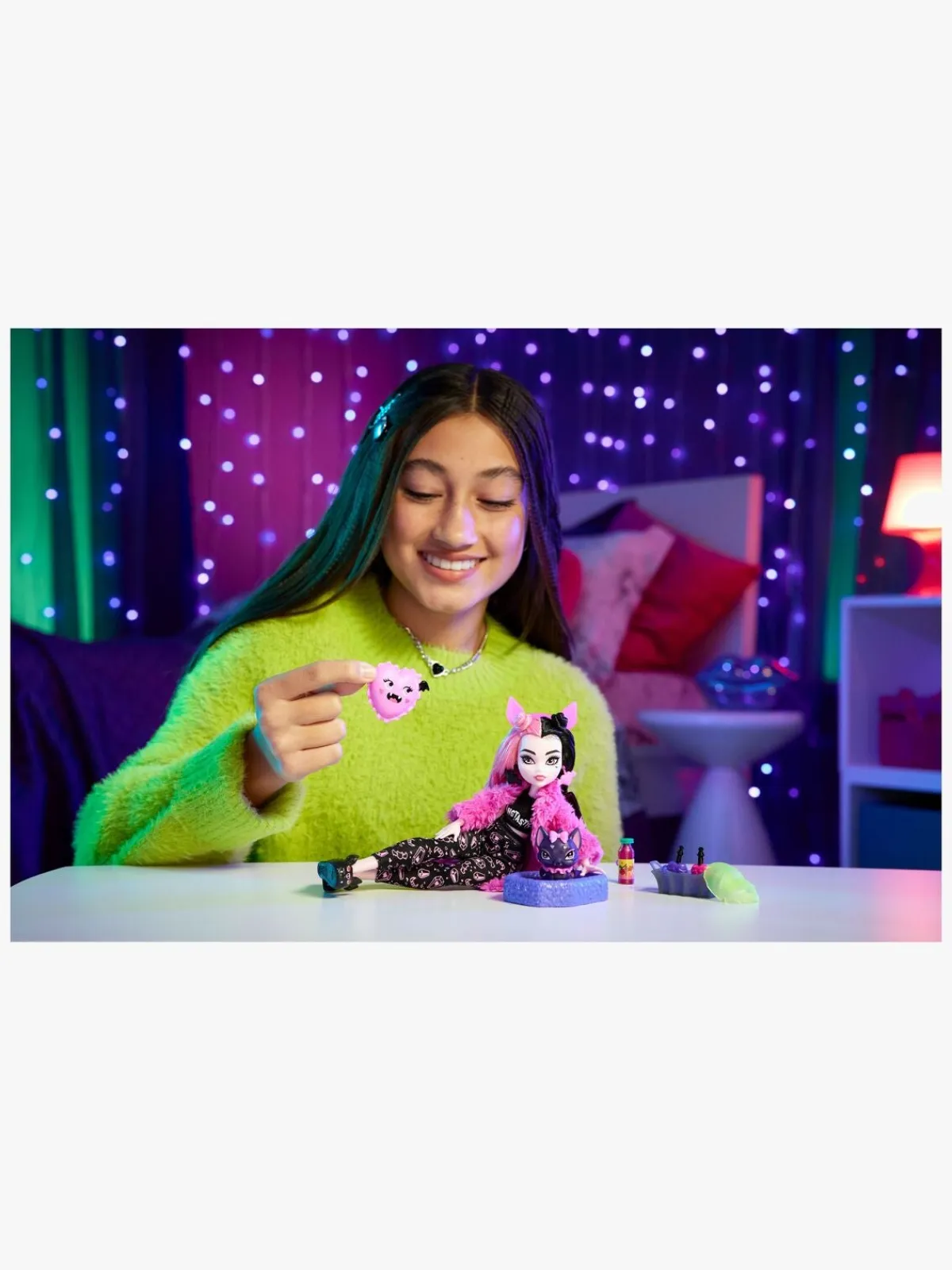 – Indeholder: 1 dukke, 1 kæledyr, 1 telefon, 1 dyreseng, 1 pude, 1 drink, 1 spillekonsol, 1 højttaler.