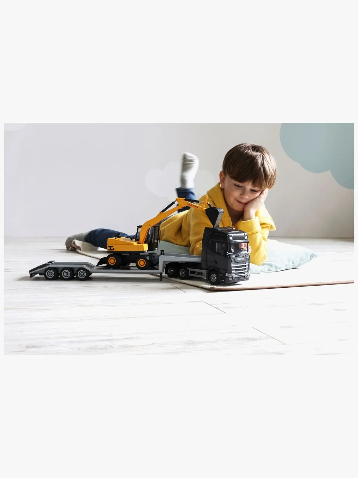 – Indeholder en blokvogn og en gravemaskine.