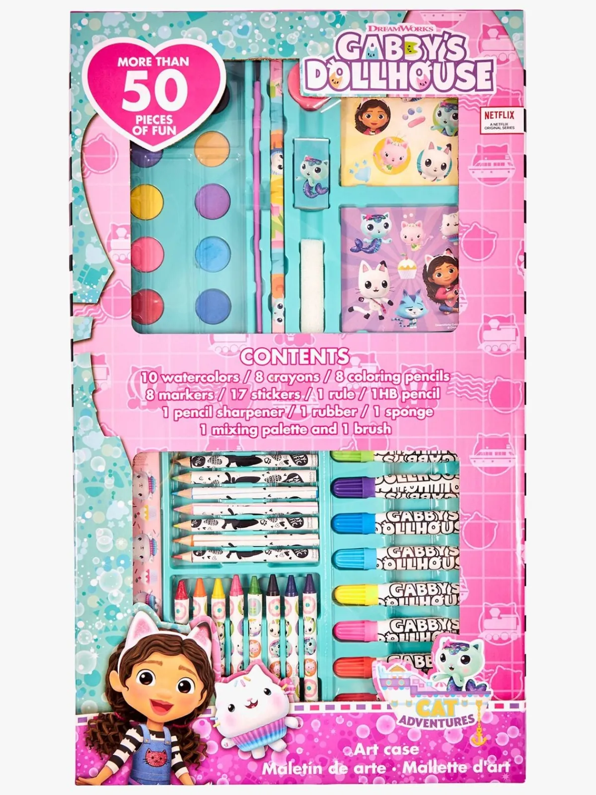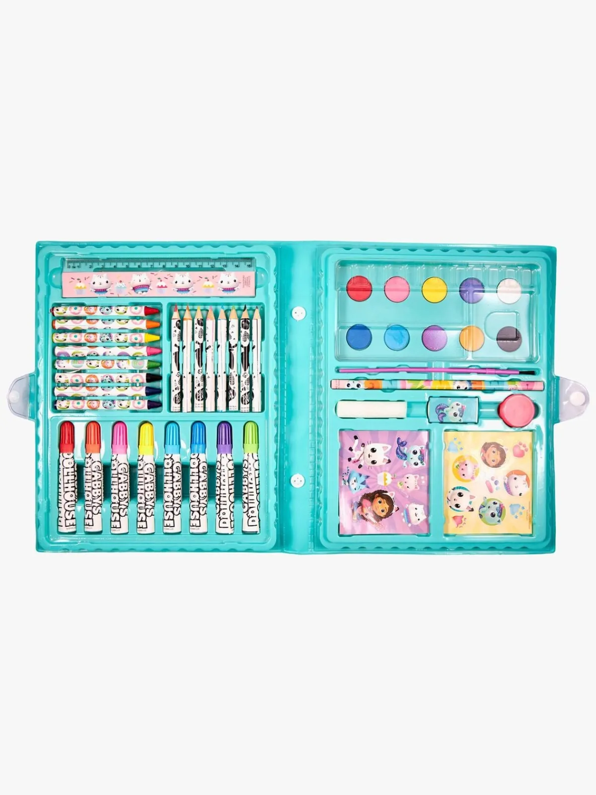– Indeholder: 10 vandfarver, 8 farvekridt, 8 farveblyanter, 8 tusser, 17 klistermærker, 1 lineal, 1 blyant, 1 viskelæder, 1 svamp, 1 pensel, 1 palet.