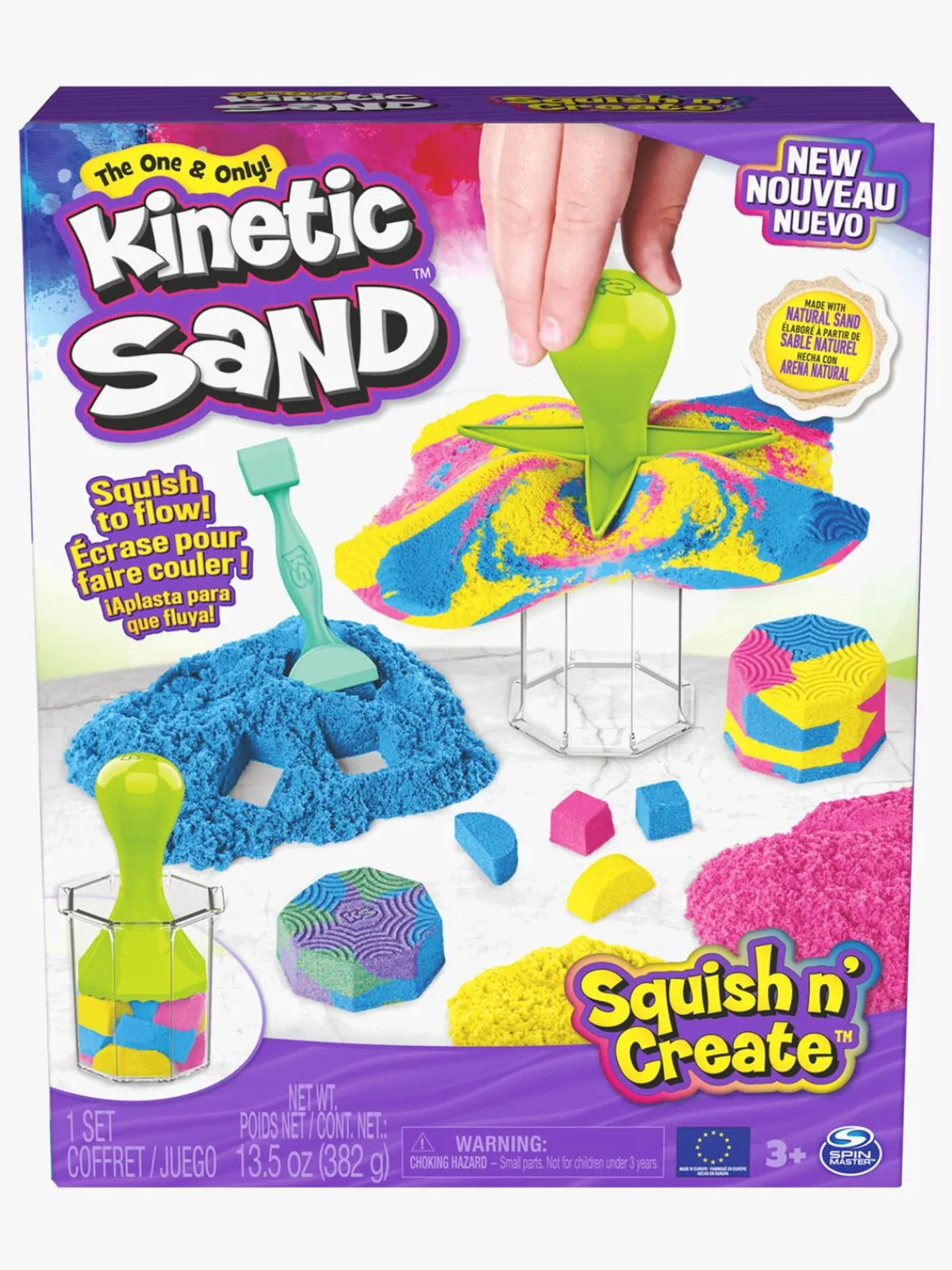 – Indeholder: 382 g Kinetic Sand, 1 Oktagonform, 1 Squisher håndtag, 1 Shape stamper, 1 Flat squish hoved, 1 Flow gaffel og 1 Cut squish hoved.