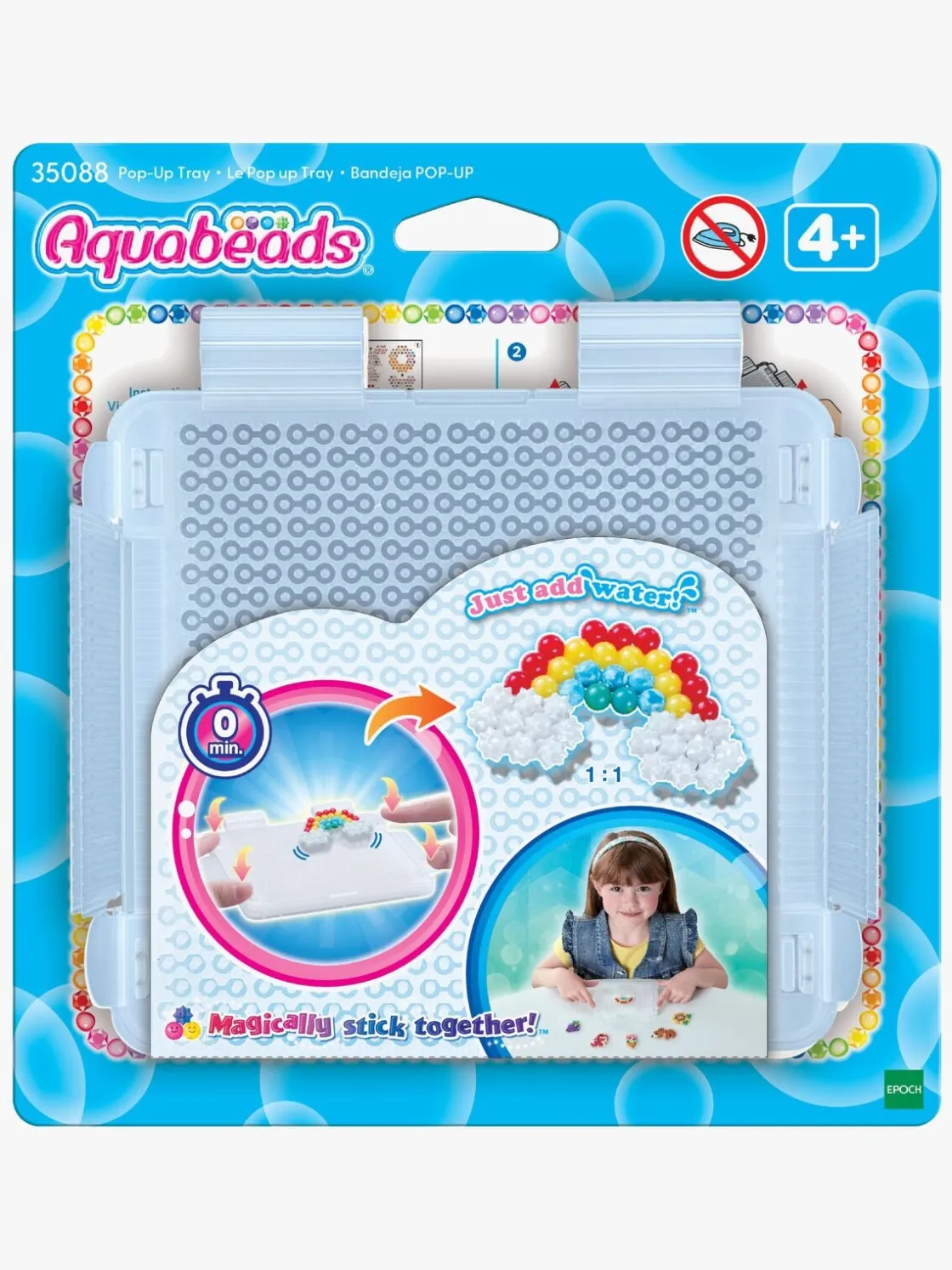 – 1. Placér skabelonen under popup-perlepladen og læg perlerne. 2. Spray med en masse vand. 3. Tryk på knappen på pladen til den siger klik. Din kreation popper op og går let løs. 4. Vend pladen, tag din kreation af og læg den til tørre på et bord.