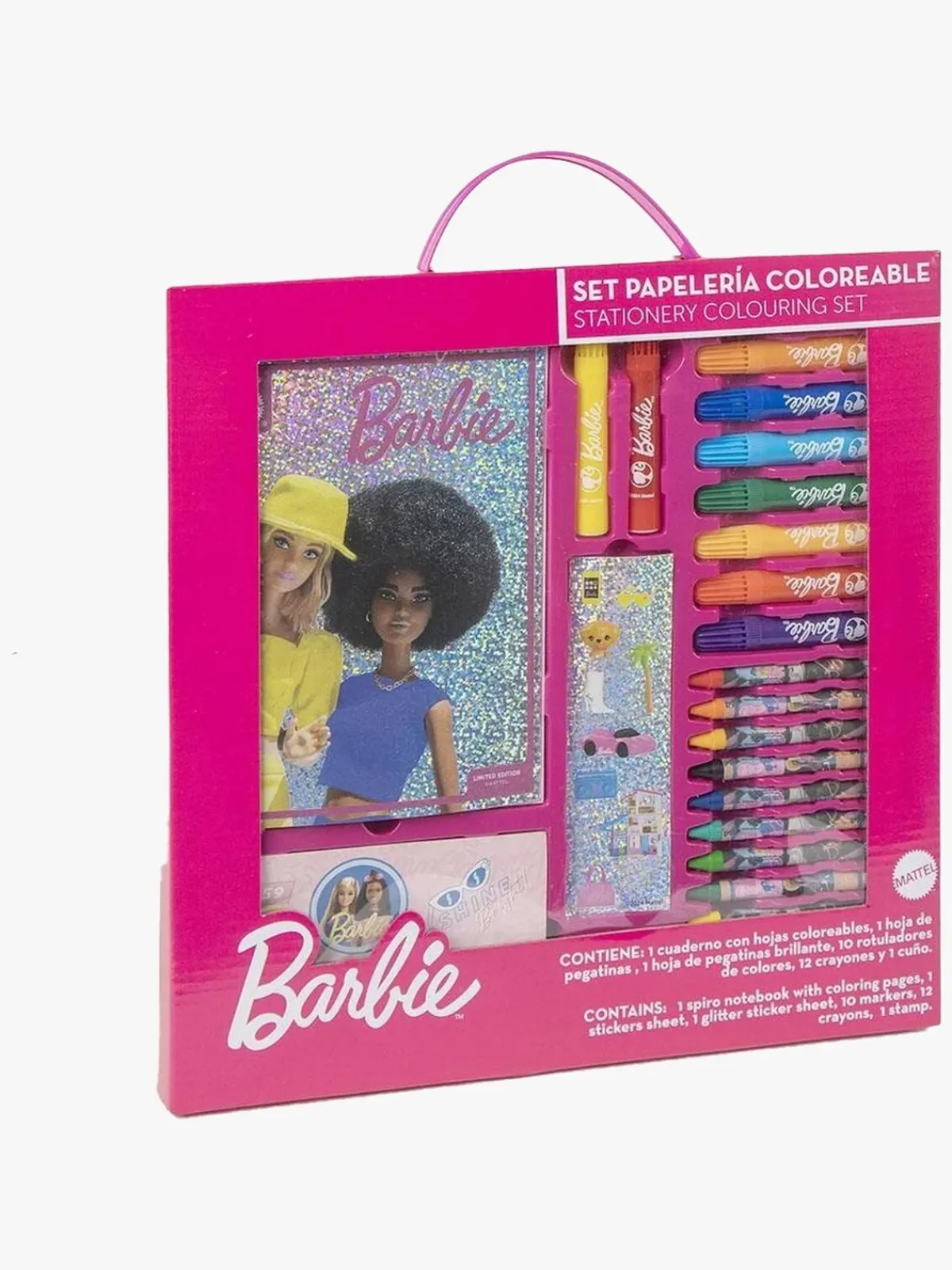 – Indeholder: 1 malebog, 12 farvekridt, 10 filttusser, 2 klistermærkeark, 1 stempel.