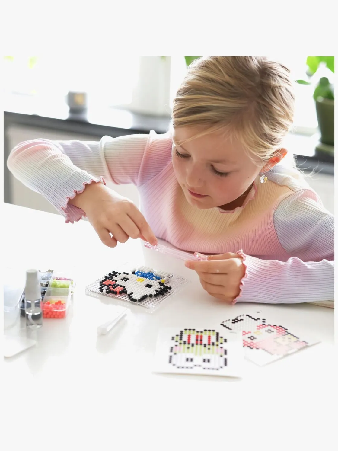 – Placer perlerne på pladen, spray med vand, vent, og så er kunstværket færdigt.