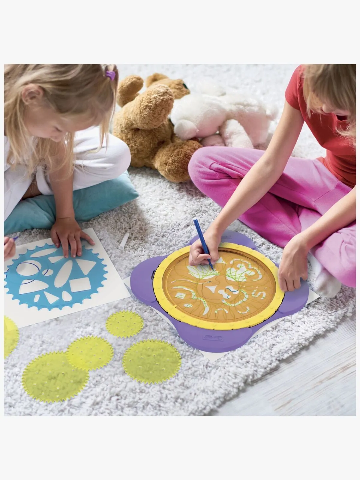 – Indeholder: 12 tegnepapirer, 12 farveblyanter, 1 spirograf, 7 tandhjul, 1 brugsvejledning.