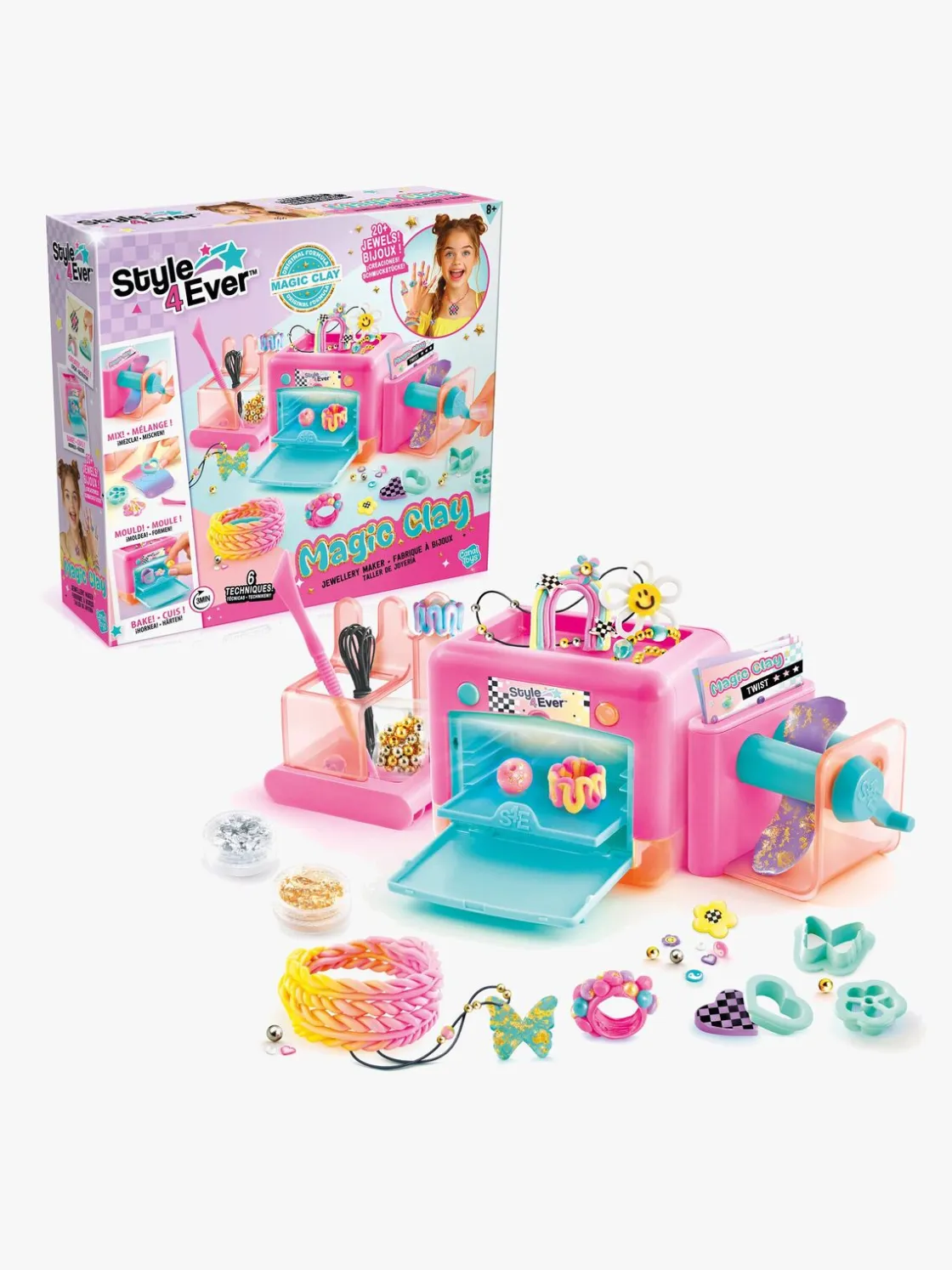 – Indeholder: 1 smykkemaskine, 6 poser med modellervoks, 6 værktøjer, 2 krukker med folier, 3 poser med dekorationer, 1 ark med klistermærker, 2 poser med perler, 2 tråde.