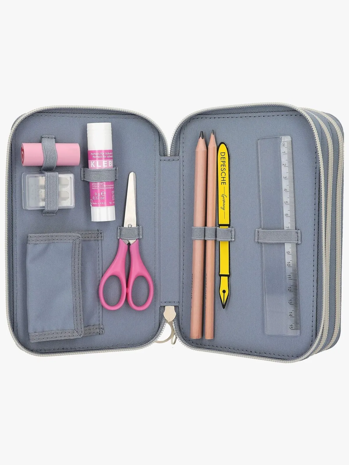 – Indeholder: 1 penalhus, 18 farveblyanter, 18 tusser, 2 blyanter, 1 saks, 1 limstift, 1 blyantspidser, 1 lineal, 1 viskelæder.