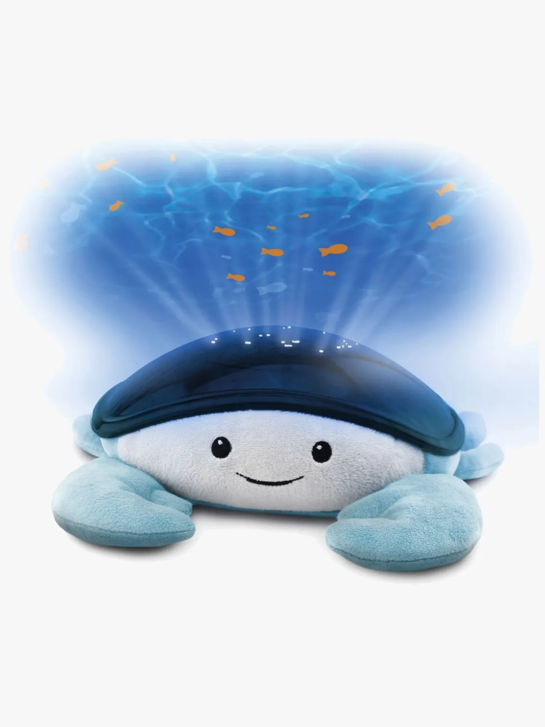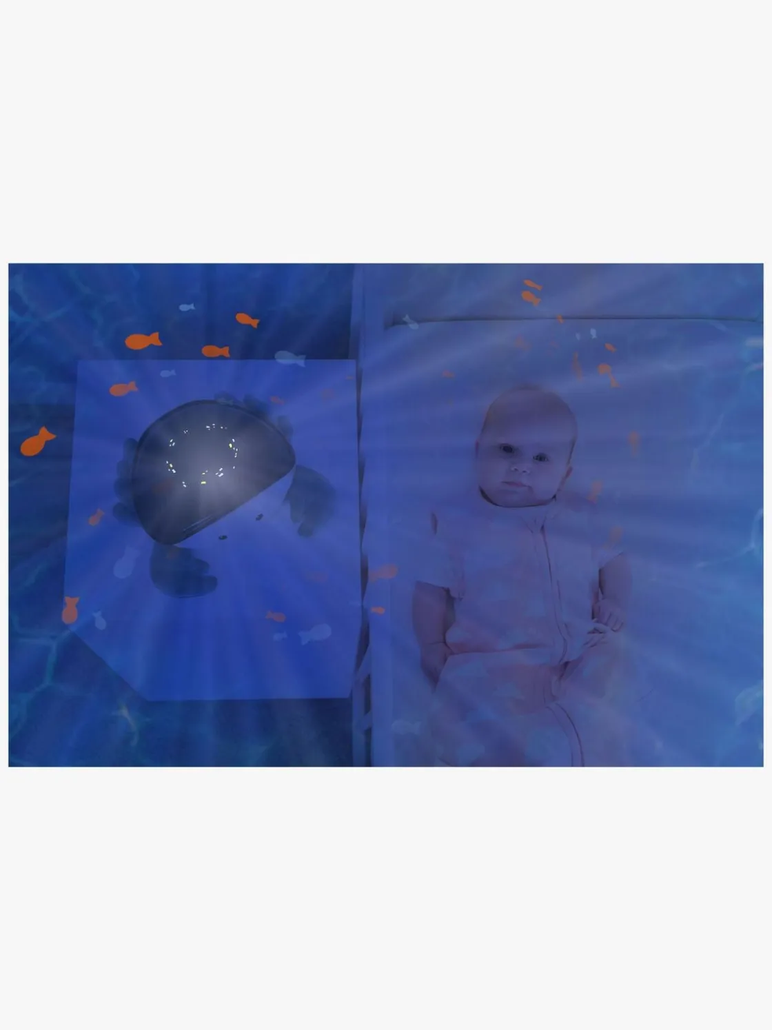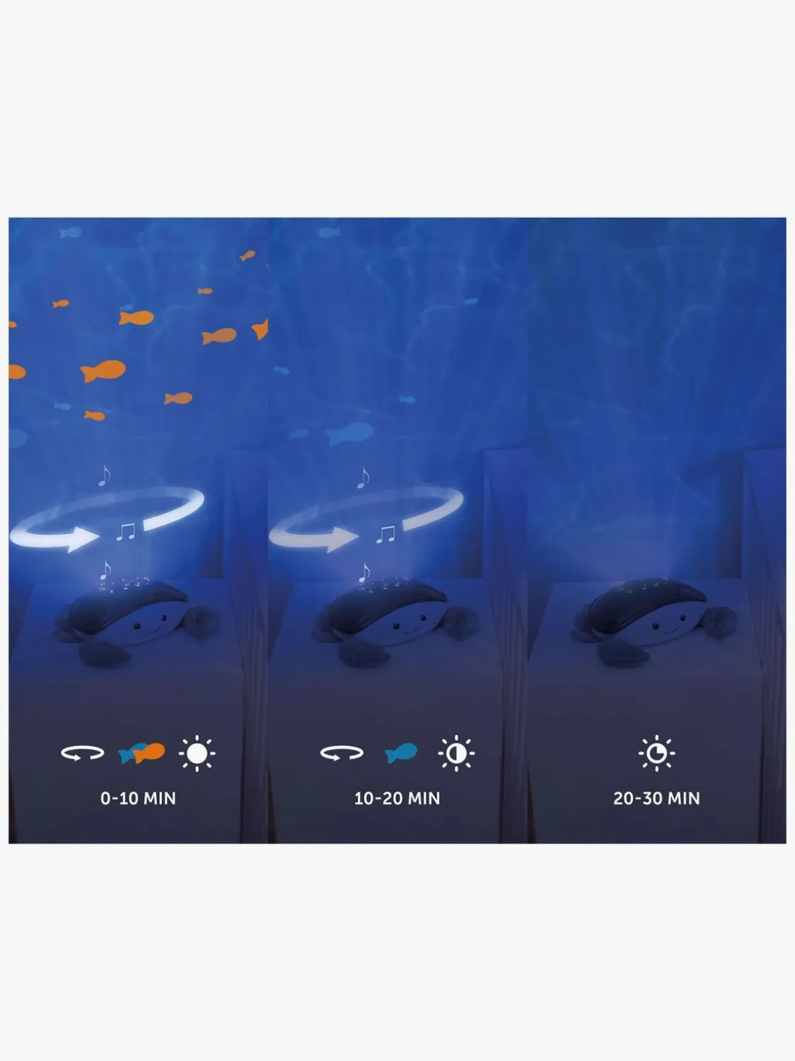 – Trin 2 (10-20 min): En svagere lysintensitet, bevægelige bølger og nu kun få fisk, der svømmer forbi. Musikken skifter til undervandsbobler.