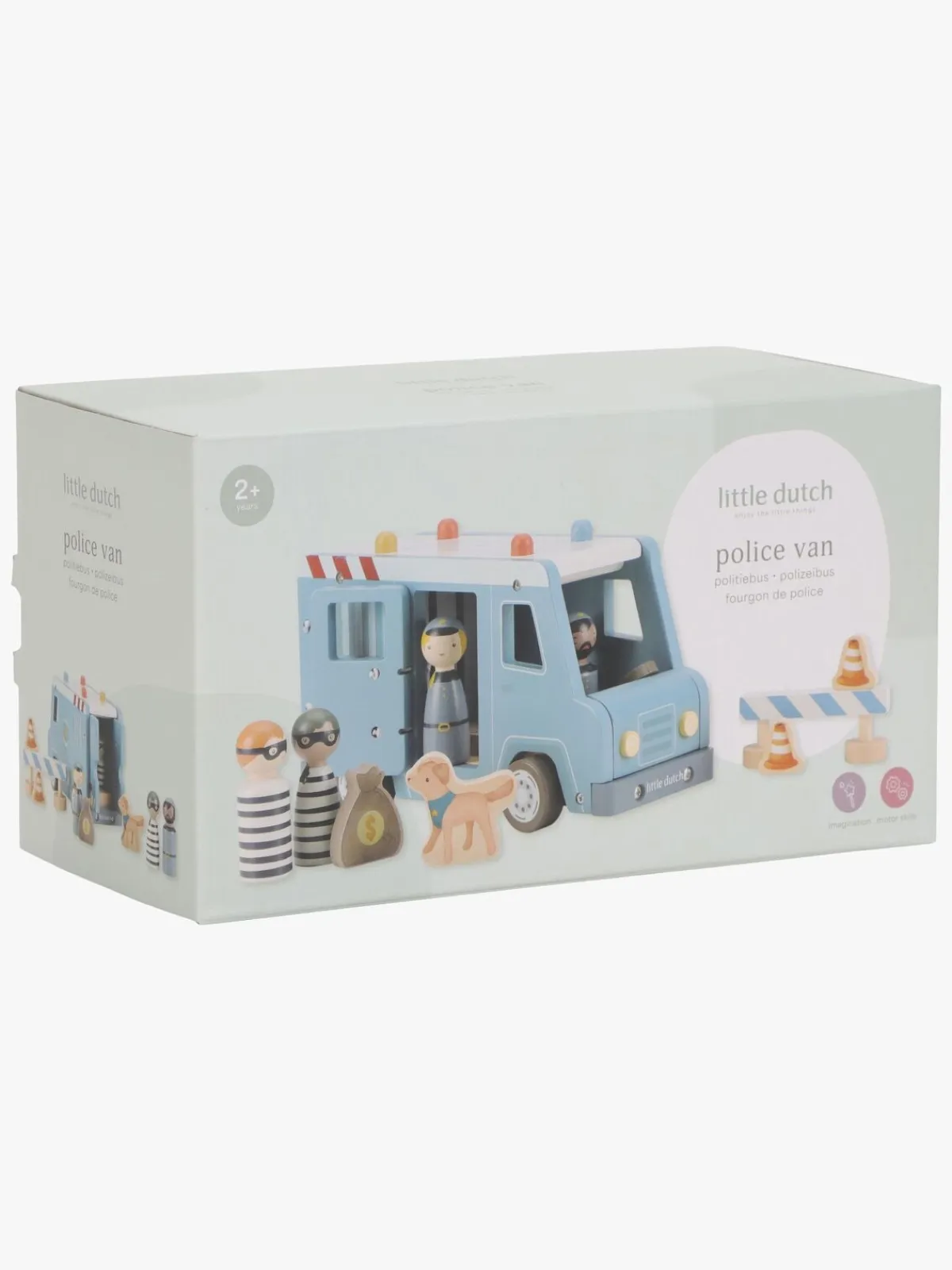 – Indeholder: 1 politibil, 2 politimænd, 2 tyve, 2 kegler, 1 pengetaske, 1 vejspærring, 1 hund.