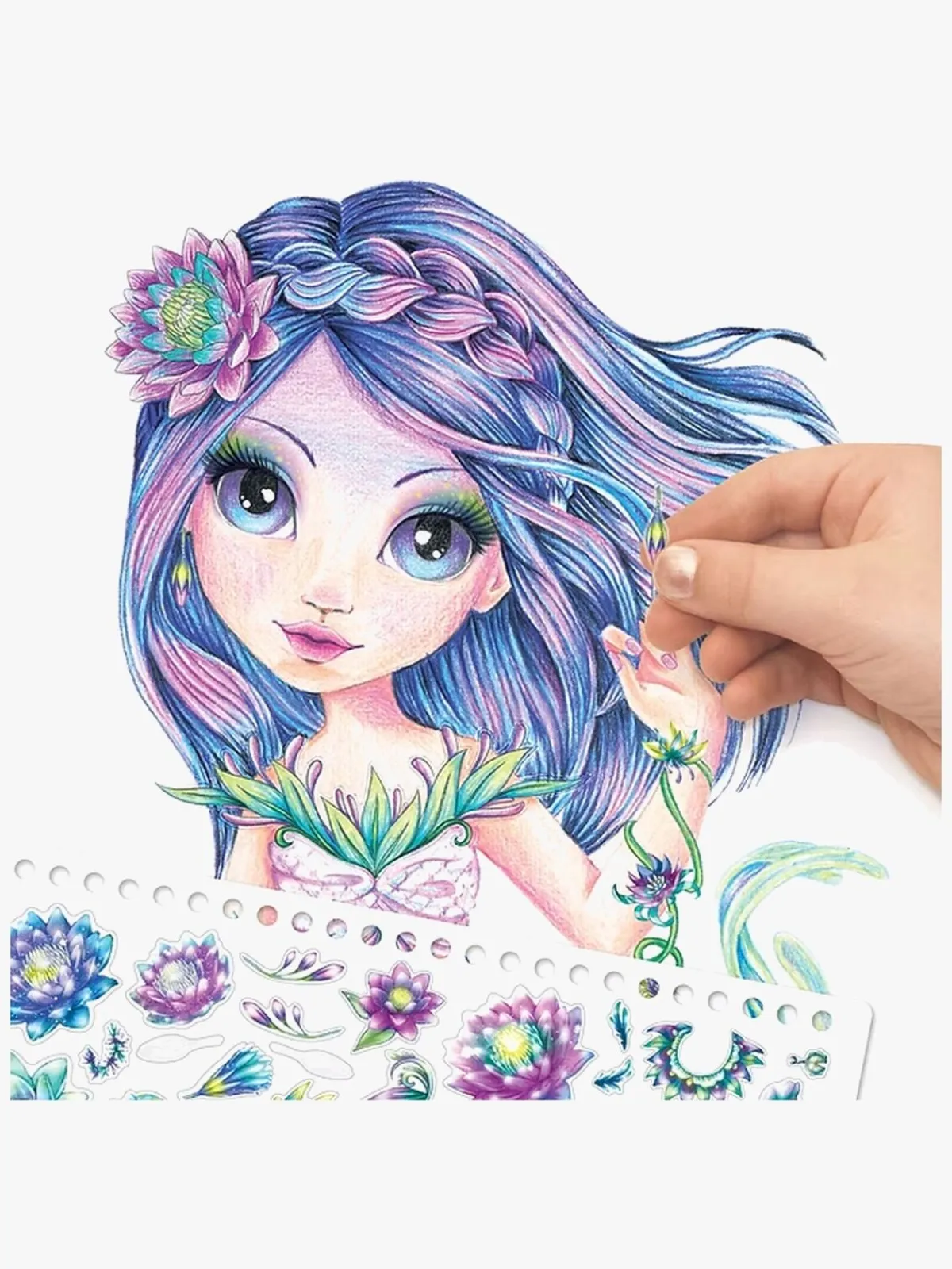 – Indeholder: 35 skitsesider, 80 stenciler, 3 mønstre til at gnide på, 250 klistermærker, 5 fibertusser med dobbeltspidser, 1 instruktionsbog.