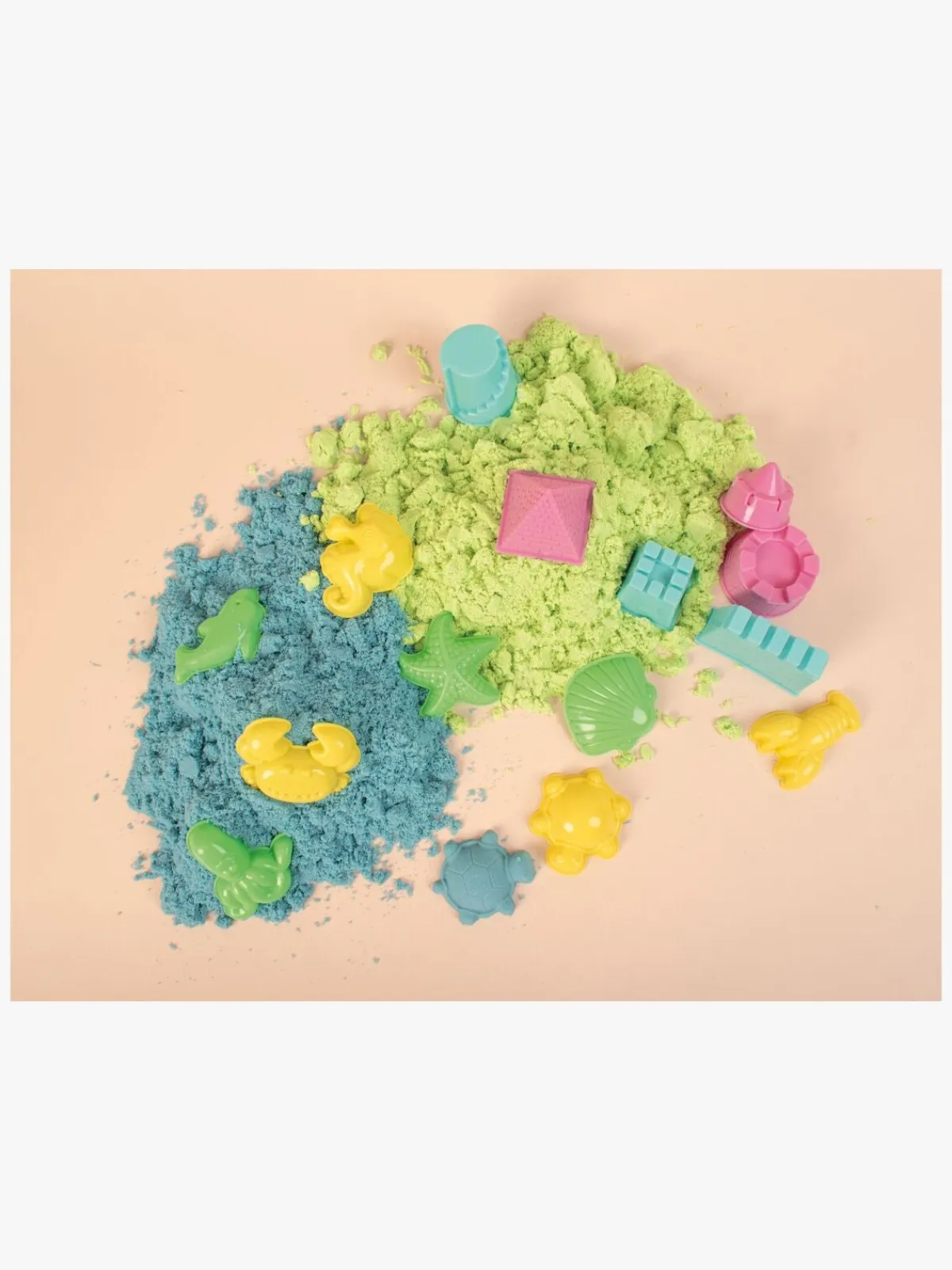 – Indeholder 2×400 g legesand (grønt og blåt).
