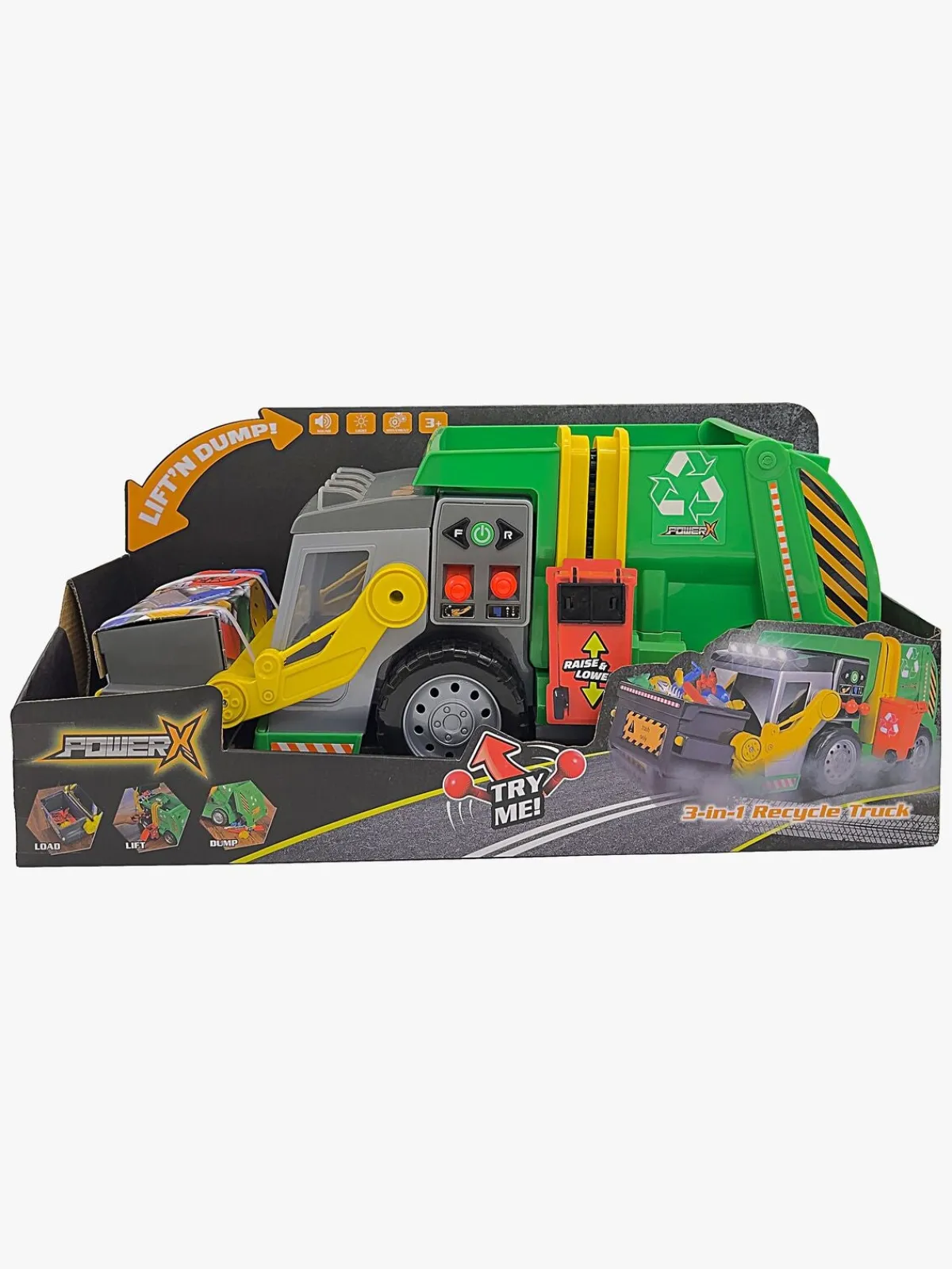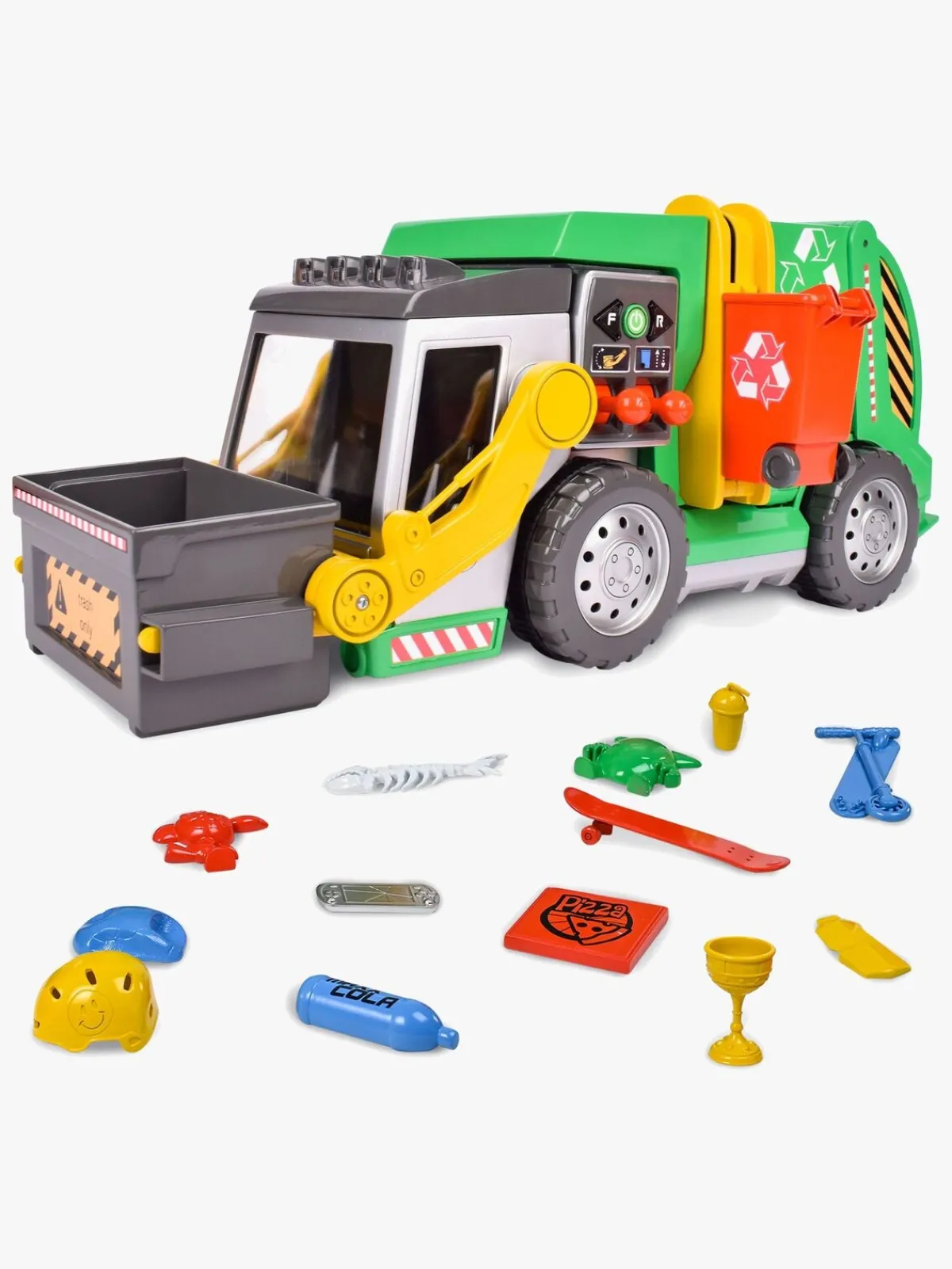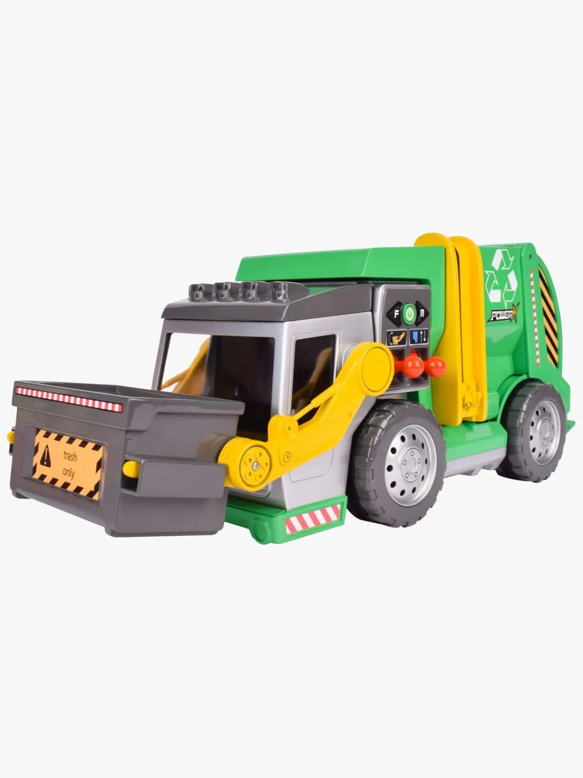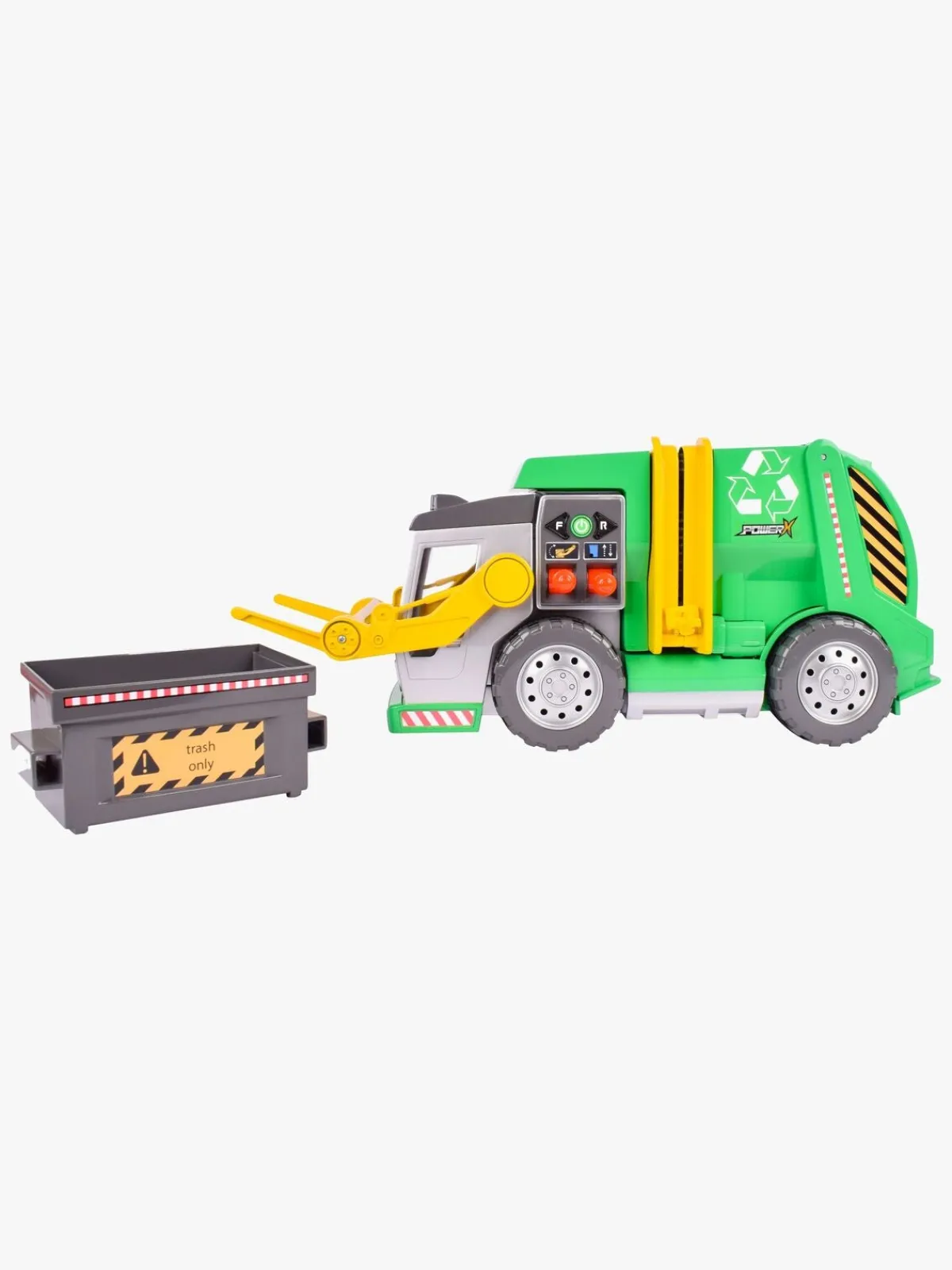 – Kan køre fremad, bakke og har dobbelt joystick til at løfte og samle skrald med!