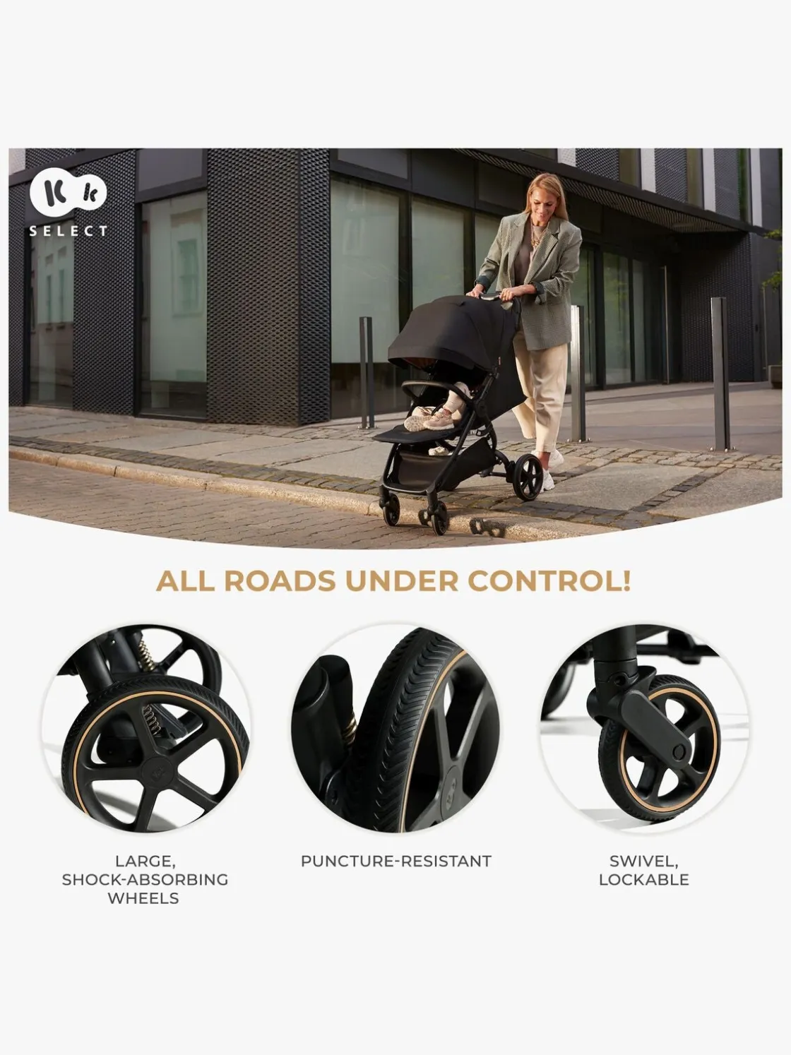 – Stor kaleche med vandtæt belægning og UPF50+.