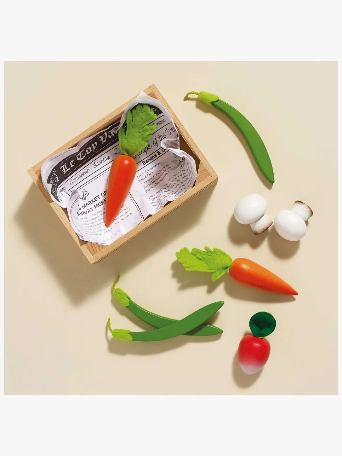 – Trækasse med avispapir for realistisk leg.