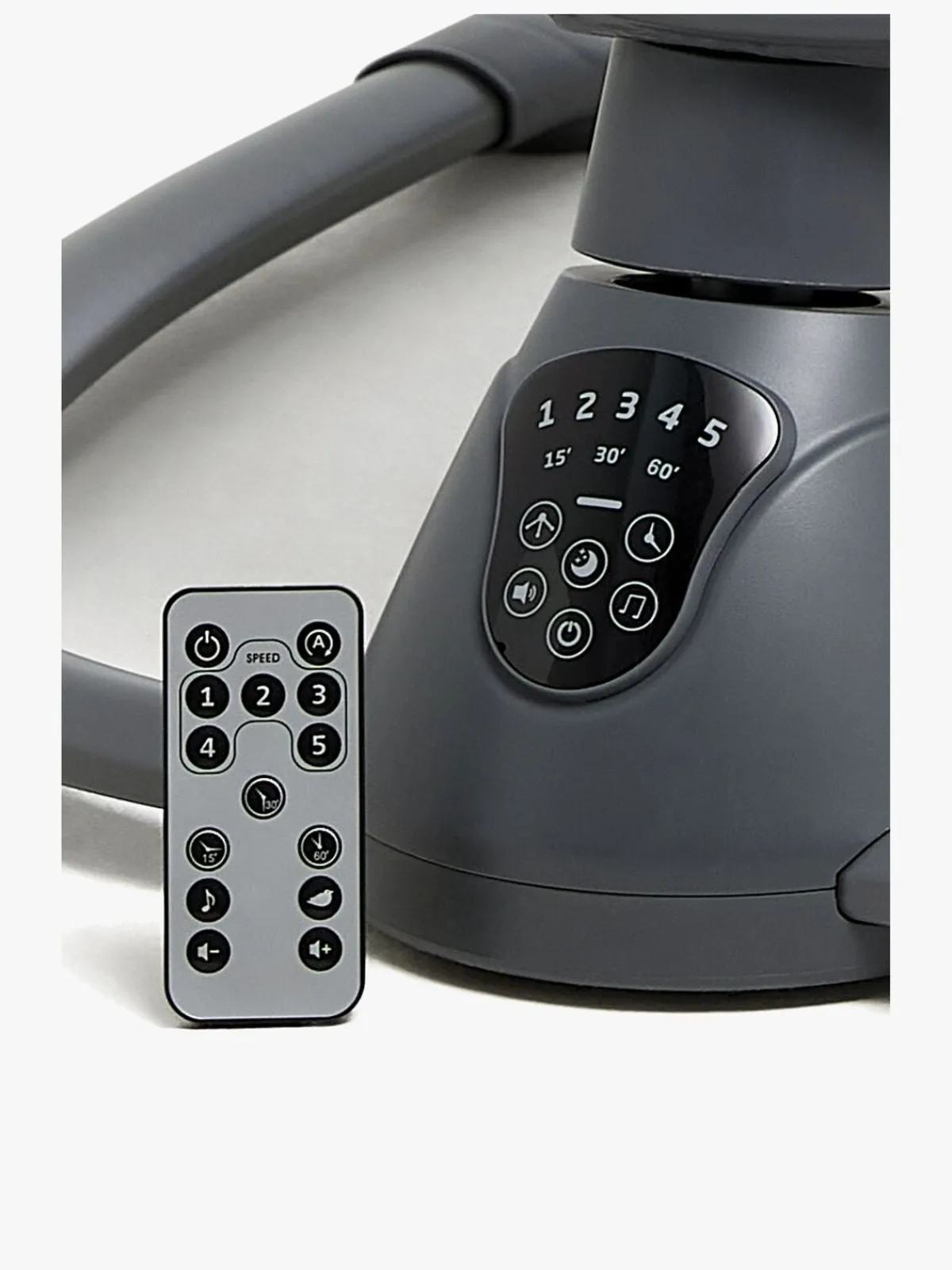 – Fjernkontrol medfølger til justering af gynge- og musikfunktion.