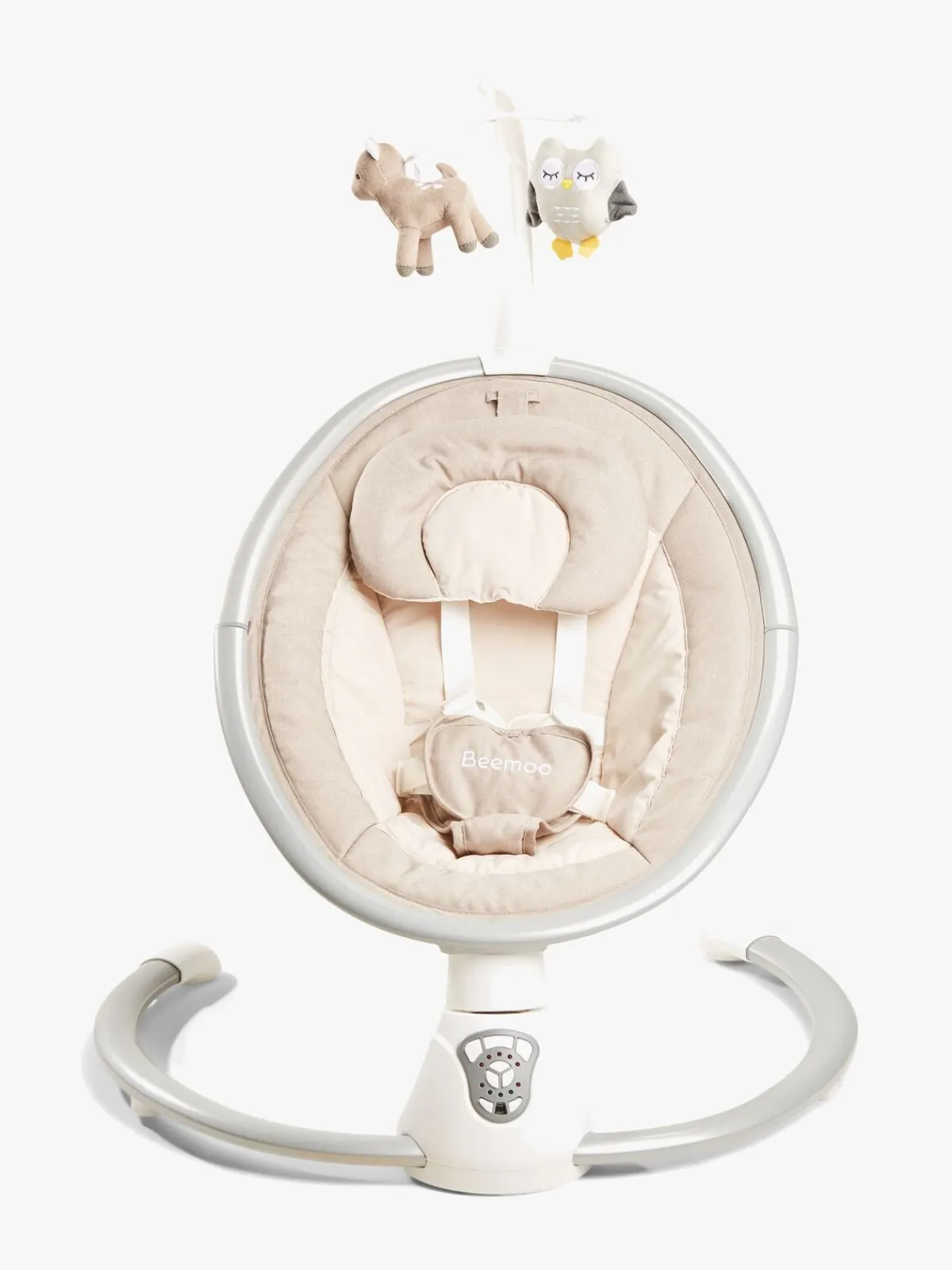 Skråstolen har en aftagelig legebøjle med to bløde figurer. Perfekt til leg eller til at berolige din baby! Det er også let at flytte legebøjlens position rundt på skråstolens ramme.