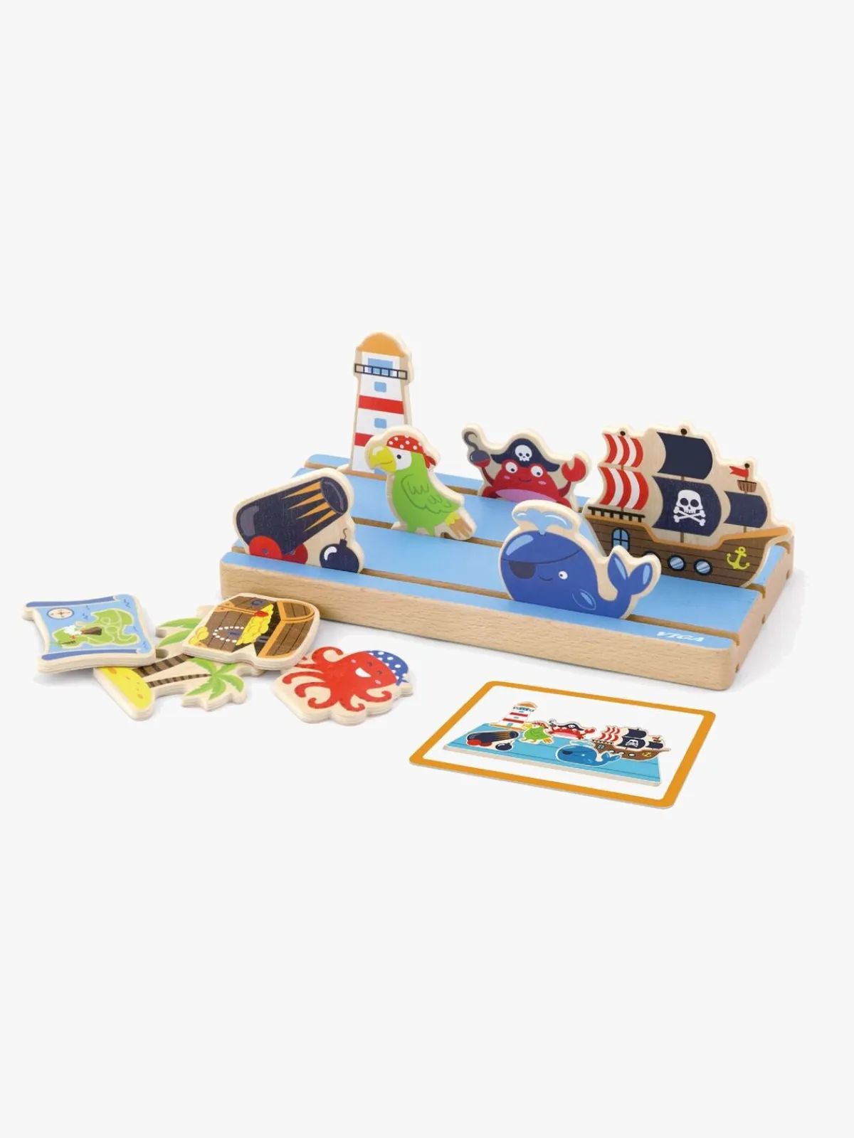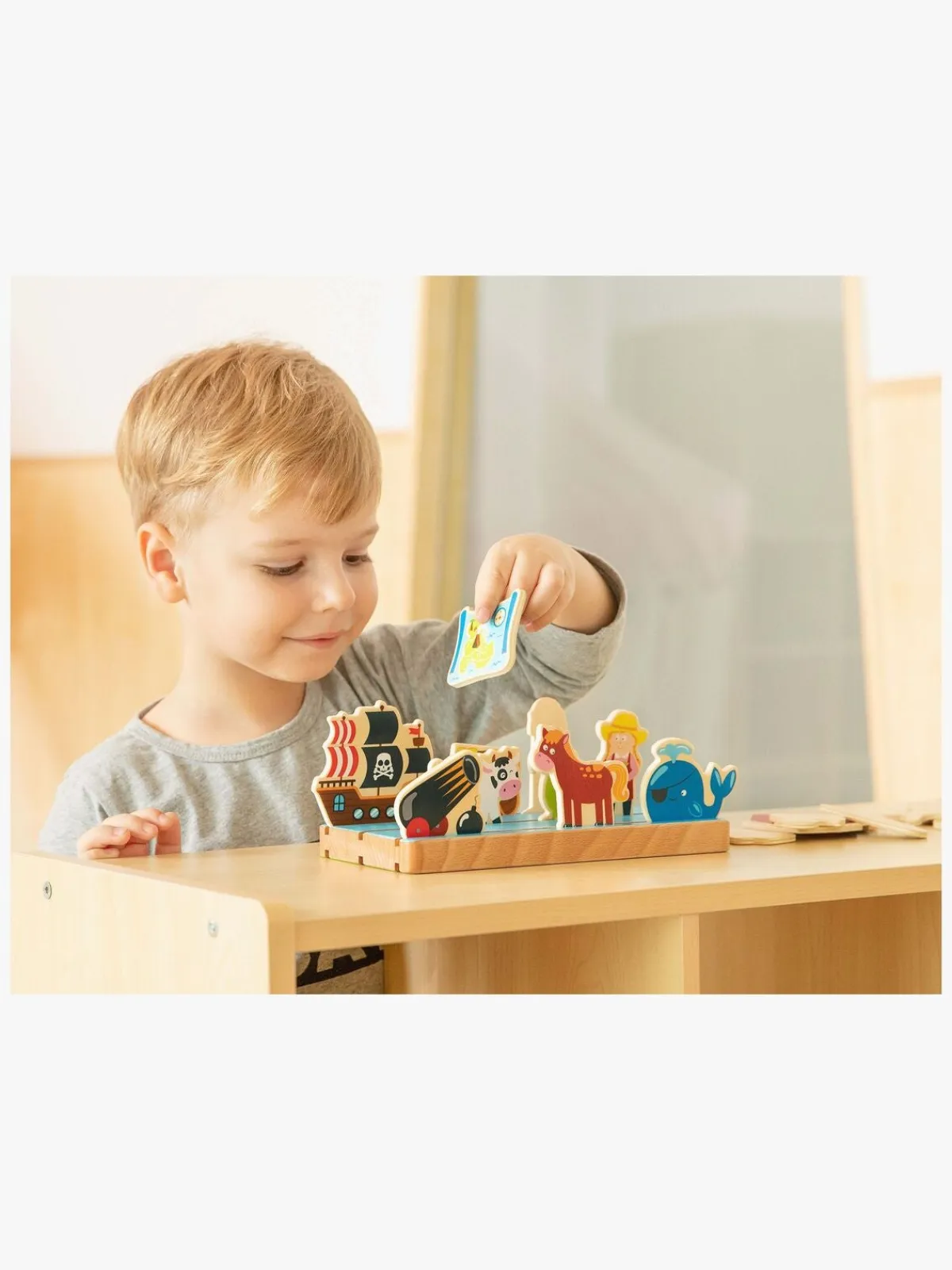 Figurerne placeres i træunderlaget, og så kan dit barn finde ud af, hvordan disse figurer forholder sig til hinanden.