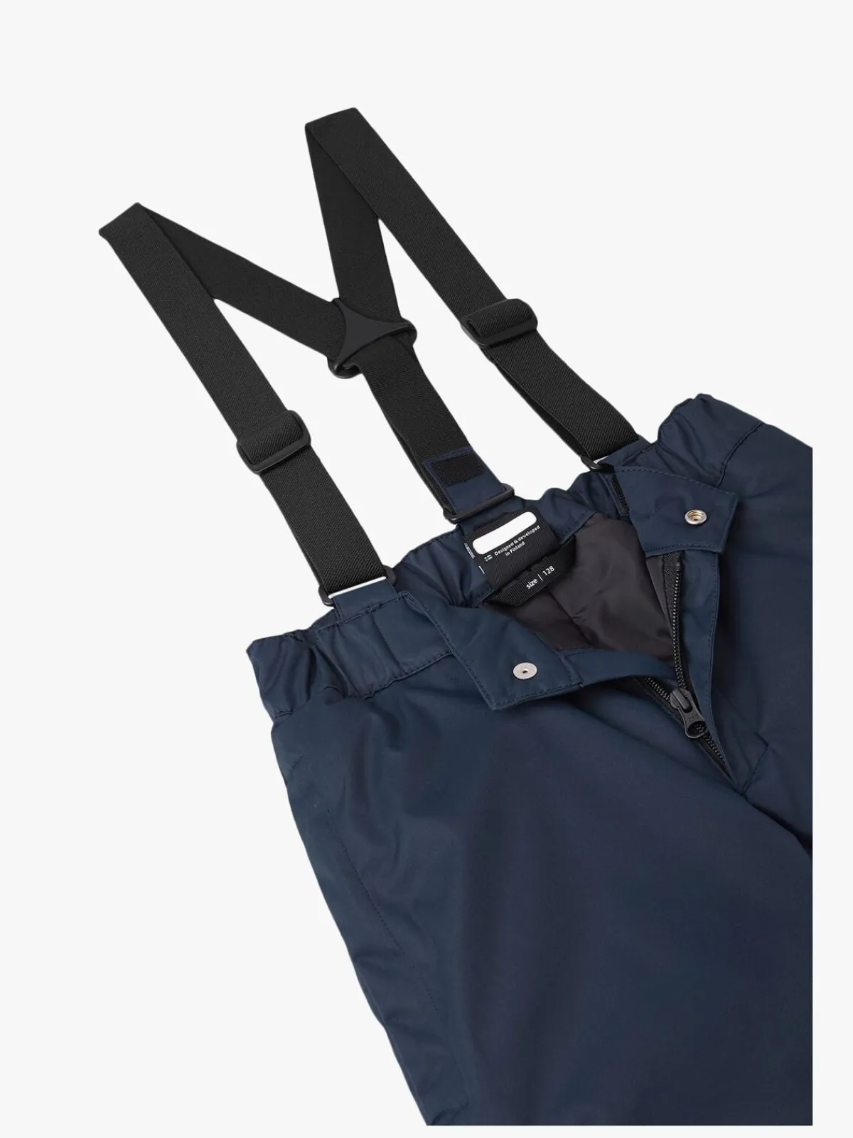 Bukserne har aftagelige seler og bukseben der kan justeres med knapper. De elastiske fodholdere er lavet af silikone og kan tages af. Bukserne har desuden en lomme der lukkes med lynlås og flere refleksdetaljer så dit barn kan ses i mørke.