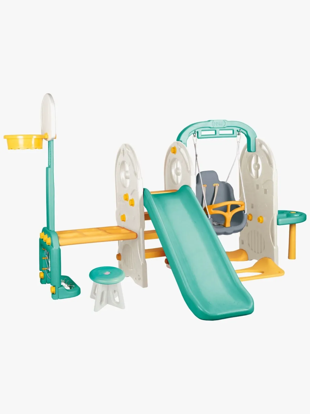 – Indeholder: 1 rutsjebane, 1 gynge, 1 skrivebord og stol, 1 fodboldmål, 1 basketkurv, 1 aktivitetsbord, 1 kant.