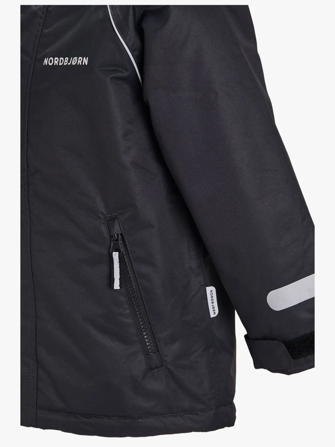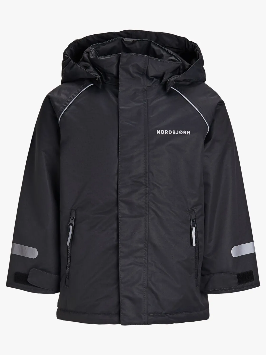 Jakken har en aftagelig hætte, lommer med lynlås og kan justeres omkring håndleddene. Bukserne har justerbare seler, elastik i taljen og ribkanter ved anklerne, så de altid sidder godt. Hele sættet har flere refleksdetaljer, så barnet kan blive set i mørket.
